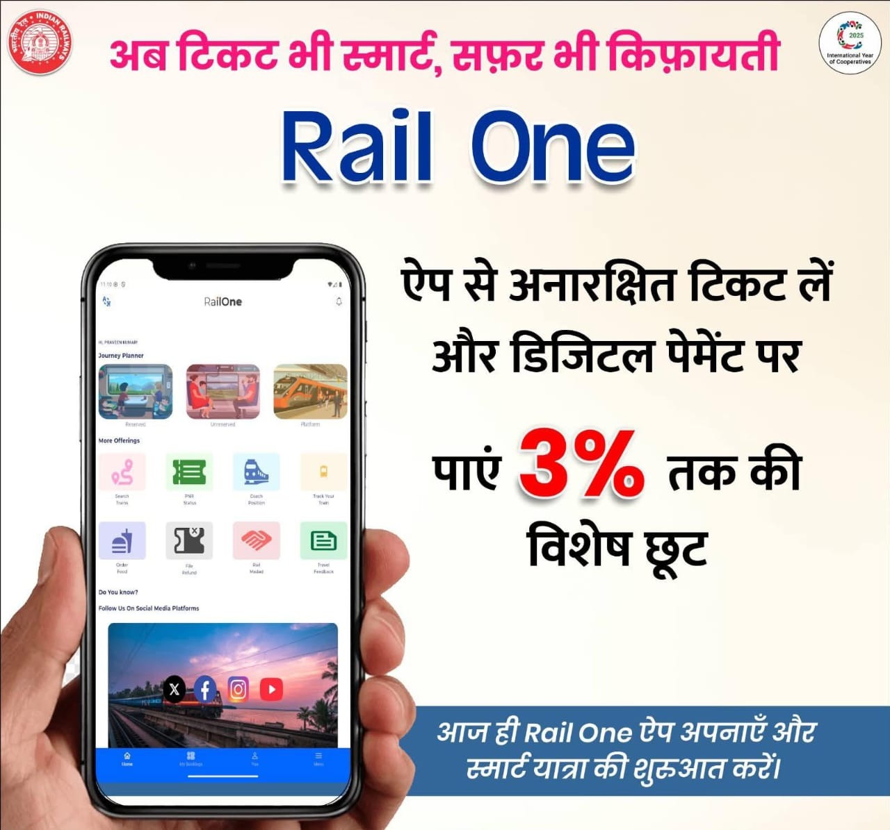 डिजिटल भुगतान को प्रोत्साहित करने के क्रम में रेलवन ऐप के माध्यम से सभी स्वीकृत डिजिटल भुगतान विकल्पों द्वारा अनारक्षित टिकट बुक करने पर यात्रियों को 3 प्रतिशत की छूट प्राप्त हो रही है | यह विशेष छूट 14 जनवरी 2026 से 14 जुलाई 2026 तक प्रभावी रहेगी | इस छूट का लाभ यूपीआई (Phone Pe, Google Pay), मोबाइल वॉलेट (Paytm), नेट बैंकिंग, डेबिट/क्रेडिट कार्ड, BHIM ऐप सहित सभी स्वीकृत डिजिटल भुगतान माध्यमों के माध्यम से रेलवन ऐप पर की गई अनारक्षित टिकट बुकिंग पर मिल रहा है |