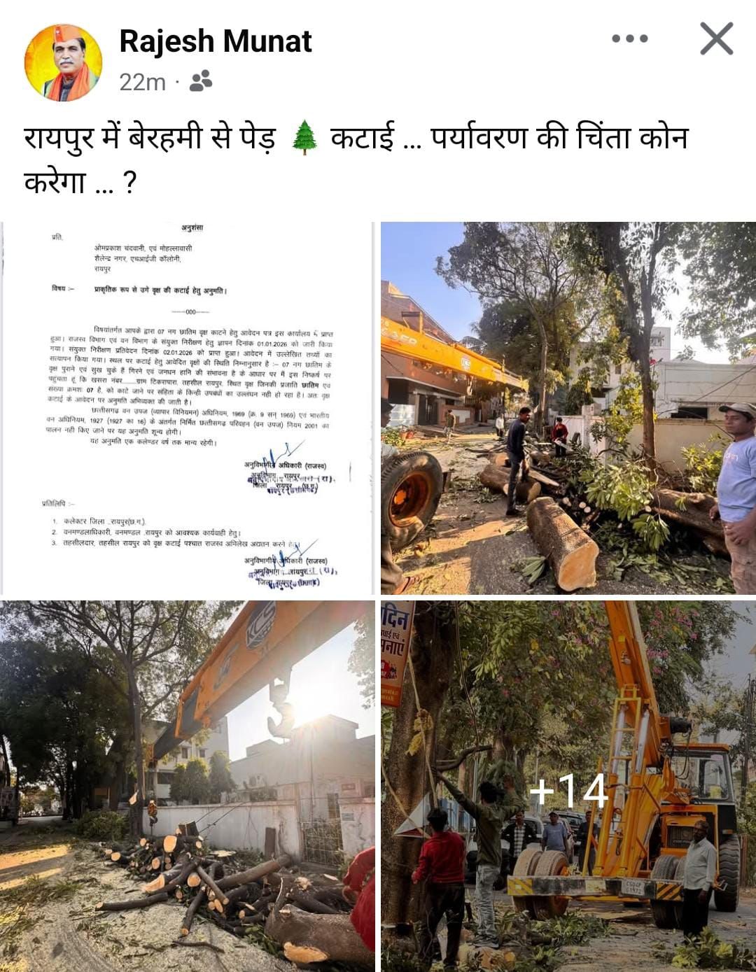 इन दिनों पुरे प्रदेश में पर्यावरण प्रदूषण को लेकर चर्चा व्याप्त है l रायगढ़, खैरागढ़, सरगुजा सहित कुछ अन्य जिलों में आंदोलन भी हो रहे है l वहीं रायपुर के शैलेन्द्र नगर क्षेत्र में एसडीएम ने 7 नग छतीम प्रजाति के वृक्ष काटने की अनुमति से पेड़ों की कटाई की गई है l इस मामले पर बीजेपी विधायक राजेश मूणत ने राजधानी में पेड़ कटाई पर आपत्ति जताते हुए सोशल मीडिया X पर पोस्ट शेयर किया है l विधायक राजेश मूणत ने अनुविभागीय अधिकारी के पत्र को भी शेयर किया है औऱ पेड़ कटाई की फोटो शेयर कर तंज कसते हुए लिखा है कि रायपुर में बेहरमी से पेड़ कटाई, पर्यावरण की चिंता कौन करेगा?
