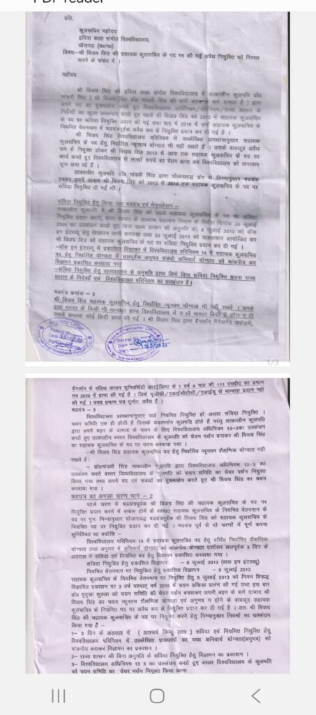 इंदिरा कला संगीत विश्वविद्यालय में सहायक कुल सचिव विजय सिंह की नियुक्ति को लेकर विवाद खड़ा हो गया है l खैरागढ़ के अंकित अग्रवाल ने कुल सचिव के नाम दिये गये शिकायत पत्र में विजय सिंह को सहायक कुलपति के पद पर की गयी नियुक्ति को अवैध बताते हुए निरस्त करने की मांग की है l उनके द्वारा दिये गये शिकायत पत्र में बताया गया है कि विजय सिंह तत्कालीन कुलपति माण्डवी सिंह की बहन का दामाद है इसलिए माण्डवी सिँह ने अपने पद का दुरूपयोग करते हुए विश्वविद्यालय अधिनियम व शासन के नियमों को दर किनार कर वर्ष 2013 में सहायक कुल सचिव के पद पर सविदा नियुक्ति की गई इसके बाद वर्ष 2016 में उसे सहायक कुल सचिव के नियमित वेतनमान में नियुक्ति प्रदान कर दी गयी, जबकि विजय सिंह सहायक कुल सचिव के लिये निर्धारित न्यूनतम योग्यता भी नहीं रखते l उनकी भारत के किसी भी मान्यता प्राप्त विश्वविद्यालय से न तो मास्टर डिग्री है औऱ न ही उसके समकक्ष कोई डिग्री प्राप्त की गयी है l ख़ास बात यह है कि कुलसचिव ने विजय सिंह को नियमित करने सविदा भर्ती के विज्ञापन प्रकाशन के तीसरे दिन ही नियमित वेतनमान का विज्ञापन प्रकाशित करवा दिया गया l यह घोर आश्चर्य का विषय है l विजय सिंह द्वारा प्रस्तुत किये गये शैक्षणिक प्रमाण पत्र भी अवैध है l वहीं प्रोफेसर मृदुला शुक्ला द्वारा चयन समिति सदस्य रूप में पात्रता न रखने के बावजूद विजय सिंह का अवैध रूप से चयन किया गया जिससे उनकी भूमिका भी संदिग्ध है l उस वक़्त भी इस अवैध नियुक्ति को लेकर कुछ लोगों ने शिकायत की थी परन्तु मंडावी सिंह ने अपने पद का दुरूपयोग करते हुए सभी शिकायतों को दबा दिया गया l अंकित अग्रवाल ने विजय सिंह की इस अवैध नियक्ति को निरस्त करने की मांग की है l माना जा रहा है कि विजय सिंह को वर्तमान कुलपति का भी वर्दहस्त प्राप्त है यही वजह है कि उसके खिलाफ किसी प्रकार की जांच नहीं हो रही है l अब देखना यह है कि इस पर कोई कार्रवाई शासन स्तर पर होती है अथवा पूर्व की तरह मामले को रफा दफा कर शिकायत पत्र को रद्दी की टोकरी में डाल दिया जायेगा l