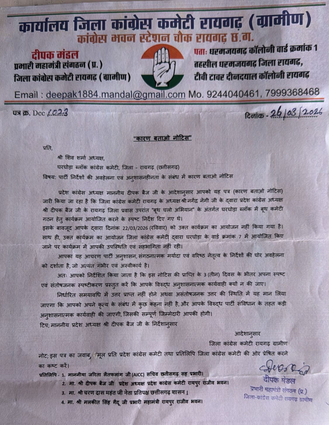 रायगढ़। जिले की चार विधानसभा में से भले ही तीन पर कांग्रेस का कब्जा है लेकिन नयी कार्यकारणी बनने के बाद से कांग्रेस के भीतर चल रही गुटबाजी अब सतह पर दिखाई देने लगी है l एक ओर जहां नगर निगम में कांग्रेस पार्षदों की संख्या काफी कम है तो वहीं दुसरी ओर परिषद की बैठक में कांग्रेस के पार्षद अपनी उपस्थिति दर्ज नहीं कराते है जिससे नेता प्रतिपक्ष अलग थलग नज़र आते हैं l वहीं चाहे ग्रामीण की बात करें या शहर की दोनों में ही कार्यकारणी गठन में माथा देख कर तिलक करने का आरोप भी लग रहा है l यही वजह है कि पुराने कार्यकर्ता संगठन से दुरी बना लिए हैं l कुछ लोग आते भी हैं तो केवल औपचारिकता निभाने l वर्तमान नेतृत्व आपसी सामंजस्य बनाने में सक्षम नज़र नहीं आ रहा है l बात स्थानीय स्तर तक हो तो कोई फर्क नहीं लेकिन संगठन से नाराजगी इस कदर कि पदाधिकारी प्रदेश स्तर के निर्देशों का पालन भी नहीं कर रहे हैं, यहां तक कि पीसीसी अध्यक्ष के कार्यक्रमों में उनकी किसी प्रकार की सहभागिता नज़र नहीं आ रही है l ऐसा ही एक मामला घरघोड़ा ब्लॉक में सामने आया है l जिला कांग्रेस कमेटी रायगढ़ (ग्रामीण) द्वारा प्रदेश कांग्रेस अध्यक्ष दीपक बैज के निर्देश पर घरघोड़ा ब्लॉक अध्यक्ष शिव शर्मा को जारी कारण बताओ नोटिस ने संगठन के भीतर लंबे समय से चल रही नाराजगी को खुलकर सामने ला दिया है। नोटिस में उल्लेख किया गया है कि प्रदेश कांग्रेस के “हाथ से हाथ जोड़ो अभियान” के तहत 22 मार्च को ब्लॉक स्तर पर कार्यक्रम आयोजित नहीं किया गया, साथ ही घरघोड़ा के वार्ड क्रमांक 7 में आयोजित जिला स्तरीय कार्यक्रम में भी उनकी उपस्थिति और सहयोग का अभाव रहा। इसे अनुशासनहीनता मानते हुए 3 दिनों के भीतर स्पष्टीकरण मांगा गया है। जबकि इस कार्यक्रम में प्रदेश कांग्रेस अध्यक्ष दीपक बैज स्वयं उपस्थित थे। नोटिस के बाद अब यह सवाल तेजी से उठ रहा है कि क्या यह केवल एक दिन की चूक है या फिरलंबे समय से चली आ रही निष्क्रिय कार्यशैली अथवा संगठन के प्रति नाराजगी का परिणाम है । स्थानीय कार्यकर्ताओं में नाराजगी इस कदर बढ़ चुकी है कि अब खुलकर यह सवाल उठ रहा है कि क्या वर्तमान नेतृत्व के कारण नए कार्यकर्ता कांग्रेस से जुड़ ही नहीं पा रहे? क्या संगठन का दायरा लगातार सिमटता जा रहा है? सूत्रों के अनुसार इस पूरी स्थिति को प्रदेश स्तर पर भी संज्ञान में लिया गया है। बताया जा रहा है कि प्रदेश नेतृत्व द्वारा क्षेत्रीय गतिविधियों का अवलोकन करने के बाद ही जिला स्तर पर सख्ती के संकेत दिए गए हैं l मौजूदा हालात को देखते हुए यह मामला अब केवल एक नोटिस तक सीमित नहीं माना जा रहा। यह पूरे संगठन की कार्यप्रणाली, नेतृत्व की विश्वसनीयता और भविष्य की दिशा पर बड़ा सवाल बन चुका है। अब नजर इस बात पर है कि शिव शर