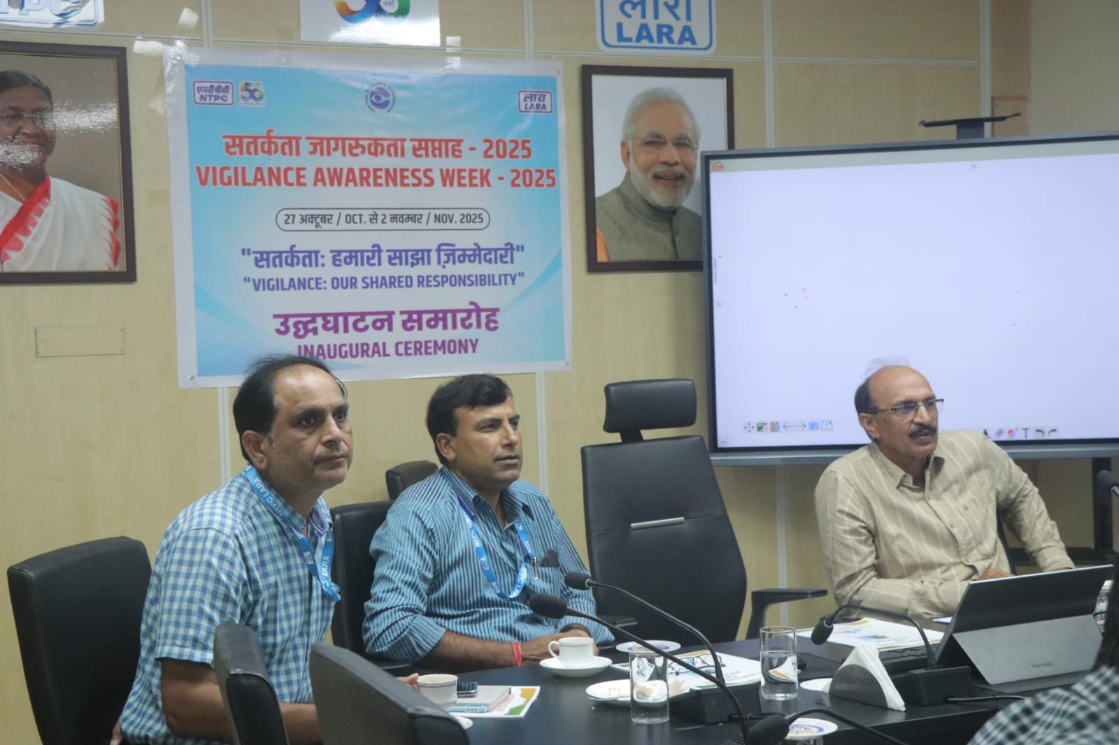 इस सप्ताह की शुरुआत एनटीपीसी लारा के मुख्य महाप्रबंधक (परियोजना) रविशंकर द्वारा केसीएस रॉय, महाप्रबंधक (प्रचालन एवं प्रबंधन) और हेमंत पावगी, महाप्रबंधक (औद्योगिक) की उपस्थिति में, विभागाध्यक्षगण, कर्मचारियों और यूनियनों व एसोसिएशनों के प्रतिनिधियों की उपस्थिति में हुआ। इस अवसर पर सभी ने सत्यनिष्ठा के साथ कार्य करने के लिए शपथ लिया।